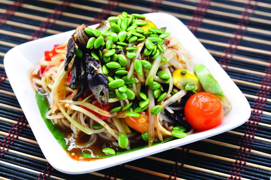 Versione tipica della famosa insalata thailandese, preparata con papaya verde, arachidi tostate, peperoncino, lime e soprattutto granchi di fiume o gamberi secchi locali. Ha un gusto più deciso e leggermente affumicato rispetto ad altre varianti. È un piatto simbolo dello street food di Chanthaburi, fresco e piccante al punto giusto.